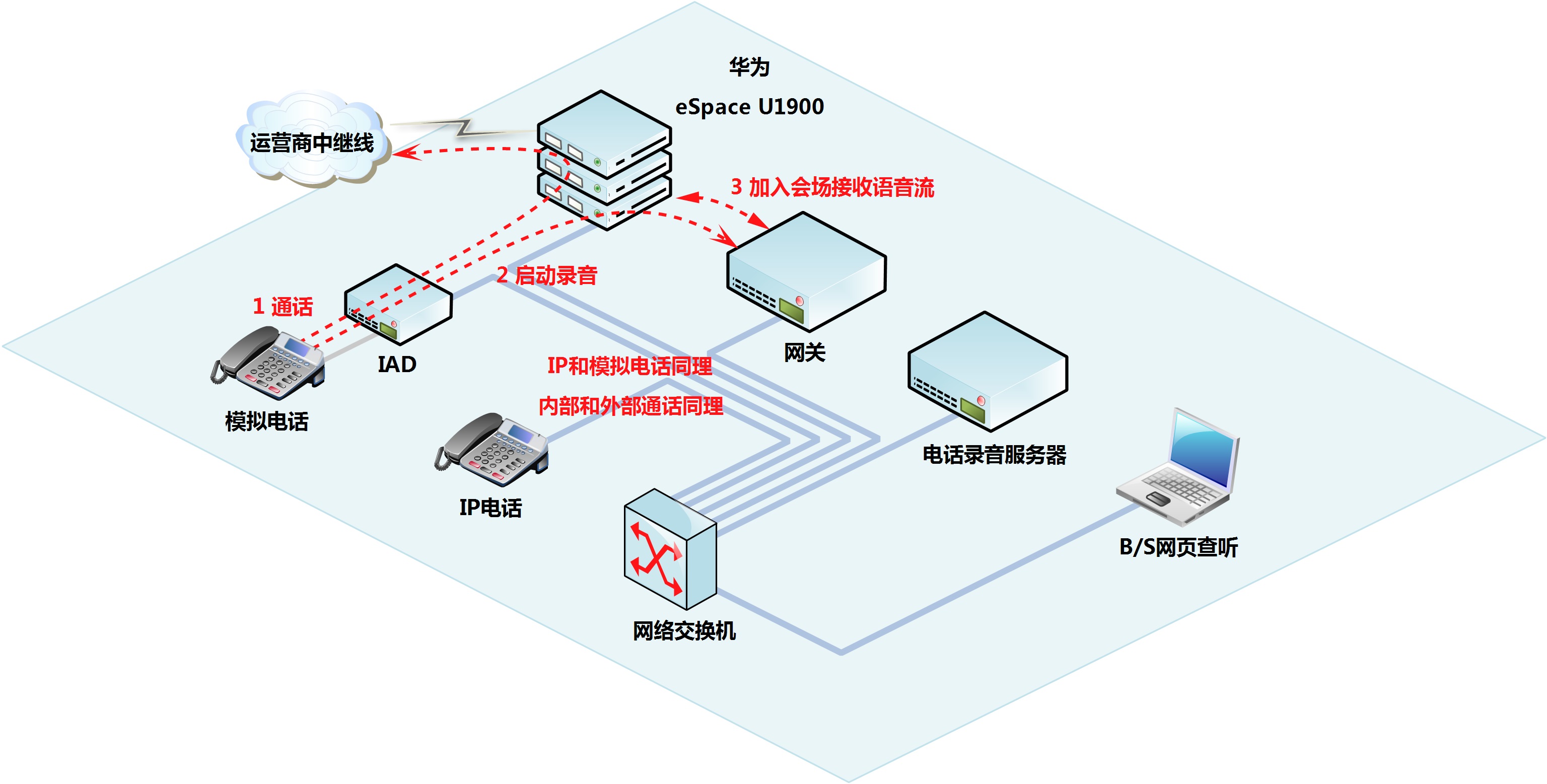 華為eSpaceU1900的IP電話或IAD下的模擬電話在通話時(shí),會(huì)自動(dòng)向錄音設(shè)備發(fā)起一方通話,將其加入到通話過(guò)程中,類似于“會(huì)議”方式,但也有別于傳統(tǒng)會(huì)議,因?yàn)槠洳徽加胑SpaceU1900的會(huì)議資源。分機(jī)內(nèi)部電話、呼出電話、呼入電話均可以通話此方案實(shí)現(xiàn)錄音,并將音頻文件存儲(chǔ)在錄音服務(wù)器上。